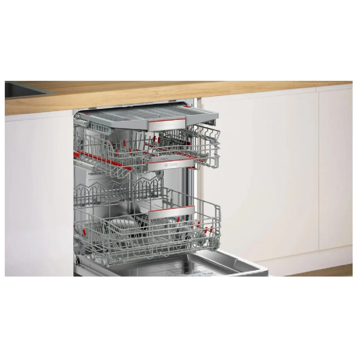 De in 3 standen verstelbare bovenkorf en besteklade bieden ruimte voor grotere keukengerei. Beladingssensoren en automatische detectie passen de hoeveelheid wasmiddel aan de hoeveelheid vaat aan. Indicatoren voor zout en glansspoelmiddel, samen met de resterende tijdweergave, vereenvoudigen het routineonderhoud. De roestvrijstalen constructie en het zelfreinigende filter dragen bij aan de duurzaamheid van de binnenkant, terwijl de vloerindicator u in één oogopslag de cyclusstatus laat zien zonder de deur te openen.