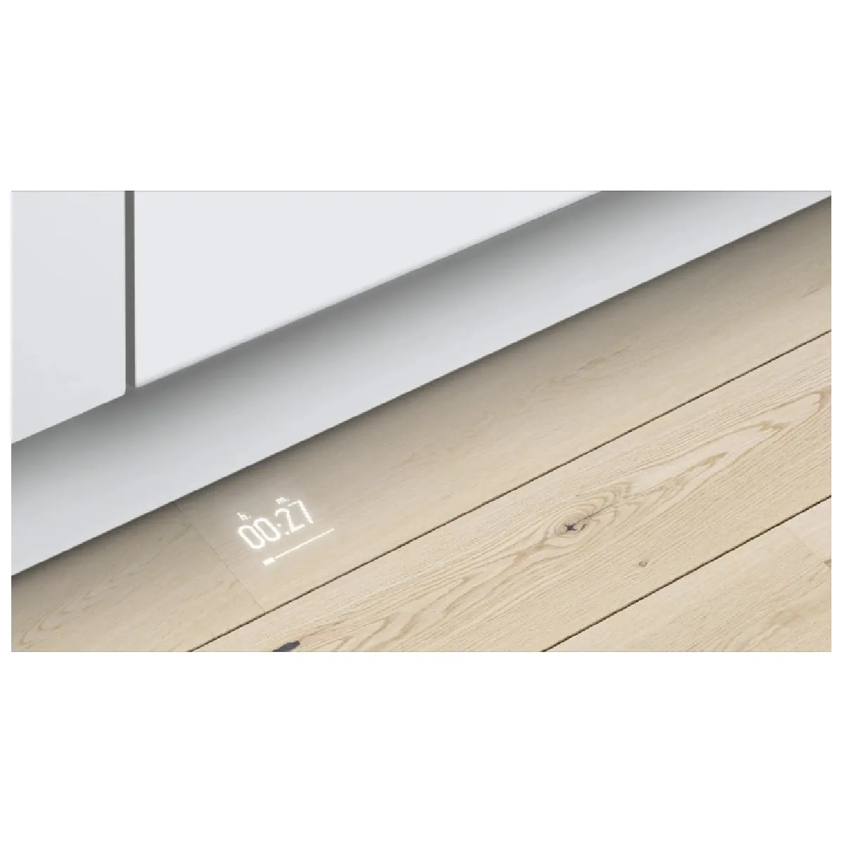 Een geoptimaliseerd programma met een waterverbruik van 9,5 liter en energieklasse A vereenvoudigt de dagelijkse afwas. Dit volledig geïntegreerde model van 60 cm biedt plaats aan 14 couverts en werkt met een gemeten geluidsniveau van 43 dB, waardoor de rust in de kamer behouden blijft. De touchscreen-interface met TFT-display maakt programmaselectie eenvoudig, terwijl bediening op afstand via Home Connect extra flexibiliteit biedt. Condensdroging, ondersteund door een warmtewisselaar en zeoliet, zorgt voor een consistent resultaat, zelfs op plastic, en minimaliseert tegelijkertijd het energieverbruik. De roestvrijstalen binnenkant en verlichte vloerindicatoren geven een duidelijk overzicht van de programma's.
