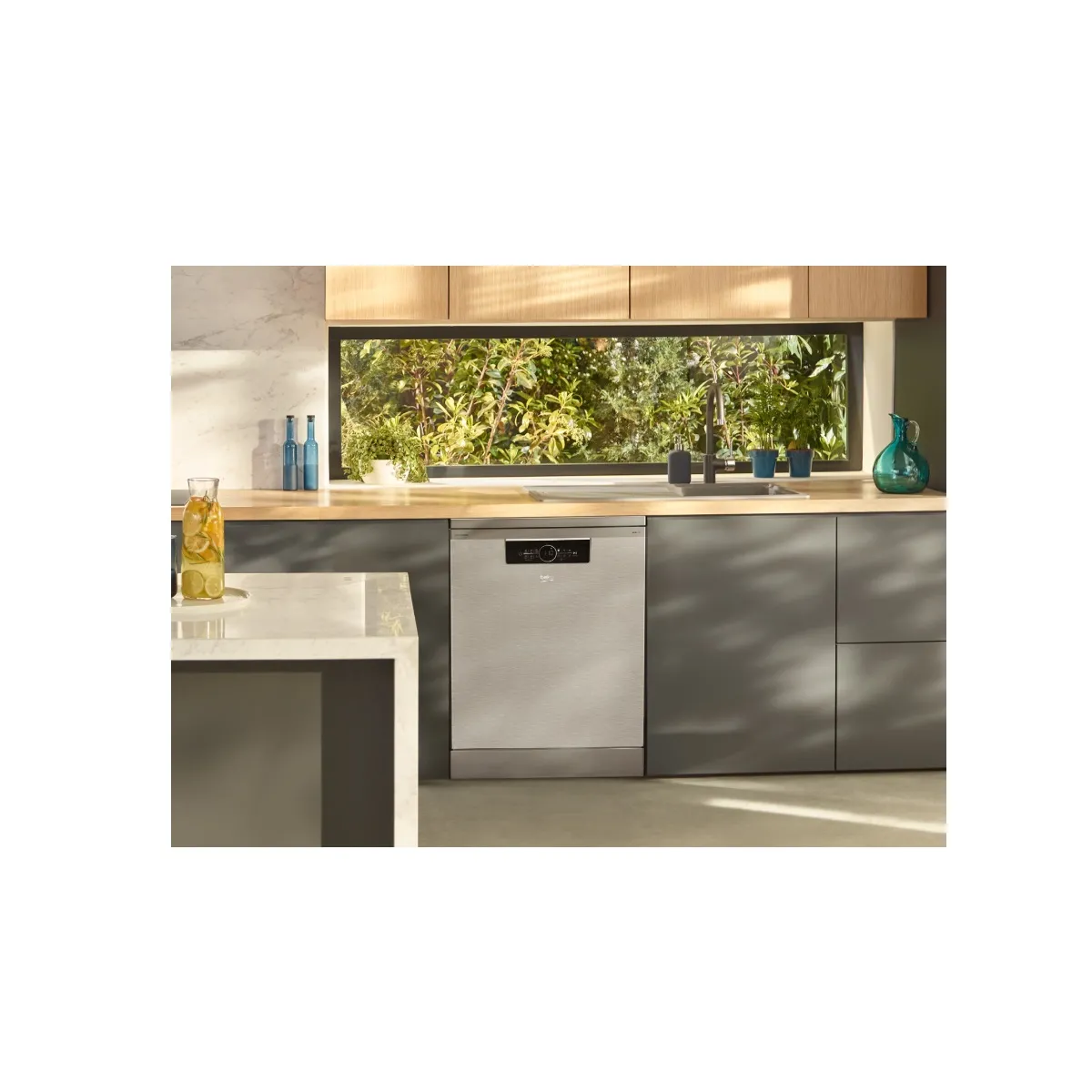 WiFi- en Bluetooth-connectiviteit bieden toegang tot gedownloade programma's en de mogelijkheid om de cyclus op afstand te bewaken. De functie voor uitgestelde start (30 minuten tot 24 uur) maakt het mogelijk om de wasbeurt op een geschikt moment in te plannen. Meegeleverde accessoires, zoals een lekbak en pannenlap, maken het gemakkelijk om specifieke keukengerei te plaatsen. De vingerafdrukbestendige roestvrijstalen afwerking met zilverkleurige accenten past perfect in moderne keukens. Dit vrijstaande apparaat heeft afmetingen van 59,8 x 60 x 85 cm. Energie-efficiëntieklasse B en droogefficiëntieklasse A maken het apparaat geschikt voor dagelijks gebruik, waarbij eenvoud en functionaliteit centraal staan.