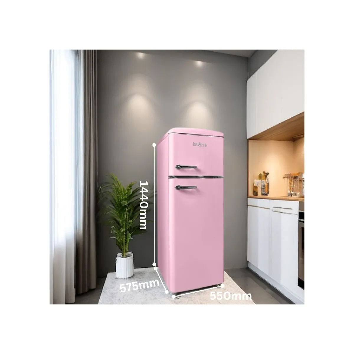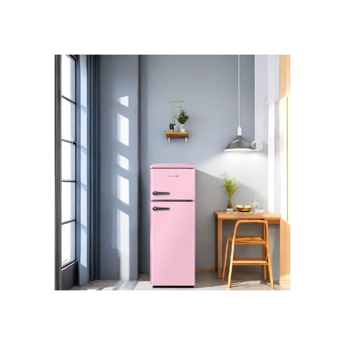 De slanke afmetingen van 55 cm breed en 144 cm hoog optimaliseren de ruimte en bieden een netto volume van 206 liter, ideaal voor een compacte keuken. Het vriesvak bovenin en het koelgedeelte van 162 liter maken dagelijkse toegang gemakkelijk. Statische koeling zorgt voor eenvoudig onderhoud, terwijl energiezuinige ledverlichting de zichtbaarheid op elke plank verbetert. Het geluidsniveau van 39 dBA zorgt voor discreet gebruik in een studio-appartement of open woonruimte. Het roze design, gecombineerd met zilveren details en vaste handgrepen, past naadloos in een modern of retro interieur zonder visuele rommel.