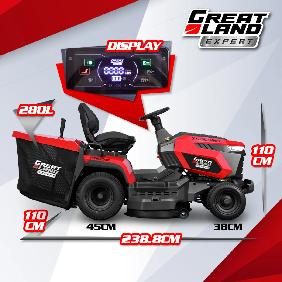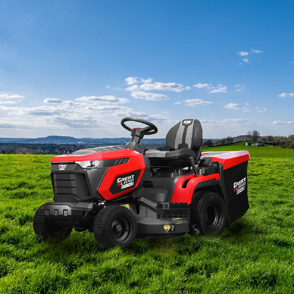 De Greatland Expert zitmaaier is uitgerust met een 586cc / 12,5kW Loncin-motor en heeft een grasopvangbak van 280 liter aan de achterzijde.