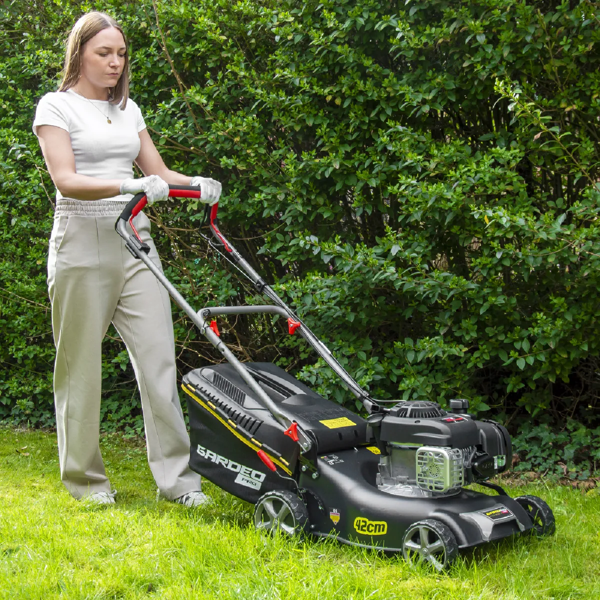 Deze zelfrijdende benzinegrasmaaier van 144,3 cc is ideaal voor het maaien van kleine tot middelgrote gazons. Met een maaibreedte van 42 cm en een opvangbak van 45 liter maait u snel grote oppervlakken.