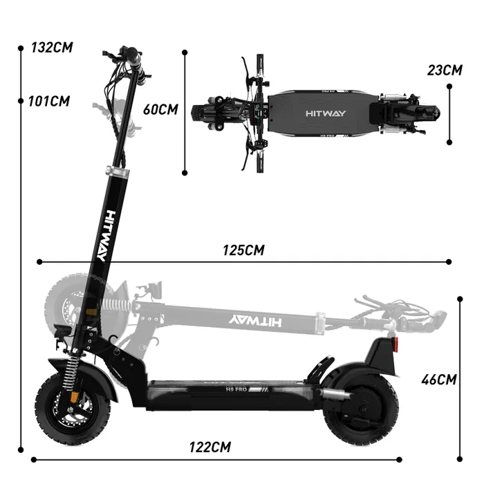 Accu met hoge capaciteit: Uitgerust met een 500W motor en een 20,8Ah accu, biedt deze scooter voldoende vermogen en een grote actieradius (tot maximaal 80-90 km) voor soepele, lange ritten. Tubeless massieve banden: De elasticiteit van tubeless banden zorgt voor een betere absorptie van trillingen van het wegdek, en de afwezigheid van een binnenband vermindert slijtage door wrijving tussen de binnenband en de buitenrand van de band. Bij een lekke band loopt het water langzamer weg, waardoor de band enige tijd voldoende druk behoudt en plotseling verlies van controle wordt voorkomen. De binnenkant van de band is bekleed met een speciaal materiaal dat kleine gaatjes automatisch dicht om lekken te voorkomen. Dubbel veersysteem: Naast de schokabsorptie van tubeless banden is de elektrische scooter uitgerust met een dubbel veersysteem voor en achter dat schokken en trillingen verder reduceert voor een soepelere rijervaring. Rem- en veiligheidssysteem: De scooter is voorzien van een betrouwbaar remsysteem, en de schijfremmen voor en achter maken snel remmen in noodsituaties mogelijk. Bovendien is de scooter voorzien van LED-koplampen en -achterlichten voor betere zichtbaarheid 's nachts, wat de veiligheid verhoogt. Robuuste 10-inch all-terrain banden: De scooter maakt gebruik van robuuste 10-inch all-terrain banden voor uitzonderlijke tractie en stabiliteit op alle soorten ondergrond. De banden bieden bovendien uitstekende grip, waardoor je in diverse offroad-omstandigheden kunt rijden. Een comfortabele rijervaring: Het dashboard toont realtime informatie zoals snelheid, batterijniveau, kilometerstand en huidige snelheid. De scooter is uitgerust met een mobiele app. Daarnaast heeft deze scooter comfortabele, in hoogte verstelbare handgrepen. Hij is snel op te vouwen en heeft een handvat voor ruimtebesparende opslag. Het brede, antislip deck zorgt voor comfort en veiligheid tijdens het gebruik. Al deze kenmerken dragen bij aan een verbeterde rijervaring. Merk: Hitway Model: H9pro Kleur: Zwart en grijs Bandenmaat: 10 inch Gewicht: Nettogewicht: 24,1 kg, Brutogewicht: 29,82 kg Afmetingen scooter: 122*60*132 cm Afmetingen ingeklapt: 125*23*46 cm Afmetingen verpakking: Buitendoos 127*25,5*45,5 cm Bereik telescopisch stuur: 30 cm (bereikbare hoogte is 101-131 cm) Lengte stuur uitgeklapt: 60 cm Lengte stuur ingeklapt: 15 cm Motor: 48 V. Motorvermogen: 500 W; Batterijcapaciteit: 48 V 20,8 Ah; Maximale belasting: 120 kg (naarmate de belasting toeneemt, nemen snelheid en actieradius af); Aanbevolen belasting: 45-100 kg; Maximale snelheid: 25 km/u (15,5 mph). Deze cijfers zijn gebaseerd op een volledig opgeladen accu zonder belasting. De snelheid neemt af naarmate het accuvermogen afneemt of de belasting toeneemt. Referentiebereik: maximaal 80-90 km (testresultaten van circa 60 km zijn gebaseerd op een niet-constante snelheidsmodus met een belasting van 75 kg. Het werkelijke bereik wordt beïnvloed door factoren zoals belasting, temperatuur, snelheid, wegomstandigheden, enz.); Geschikt voor: 16 jaar en ouder; 3 snelheidsstanden: 10 km/u; 15 km/u; 25 km/u; maximale hellingshoek: 10-15°; IP-classificatie: IP54; laadtijd: 6-8 uur; accucapaciteit: 48V 20,8Ah; banden: vacuümband; 10-inch massieve honingraatband; geschikt voor: vlakke betonnen of asfaltwegen; remsysteem: schijfrem + elektronische rem; frame: aluminiumlegering; richtingaanwijzers: dubbele richtingaanwijzers voor en achter; accu: lithium-ionaccu; De kleurrijke ledlampjes aan de zijkant van de pedalen van de scooter kunnen naar wens aan- of uitgeschakeld worden. Inbegrepen: 1x scooter; 1x voedingsadapter; 1x gebruikershandleiding (7 talen).