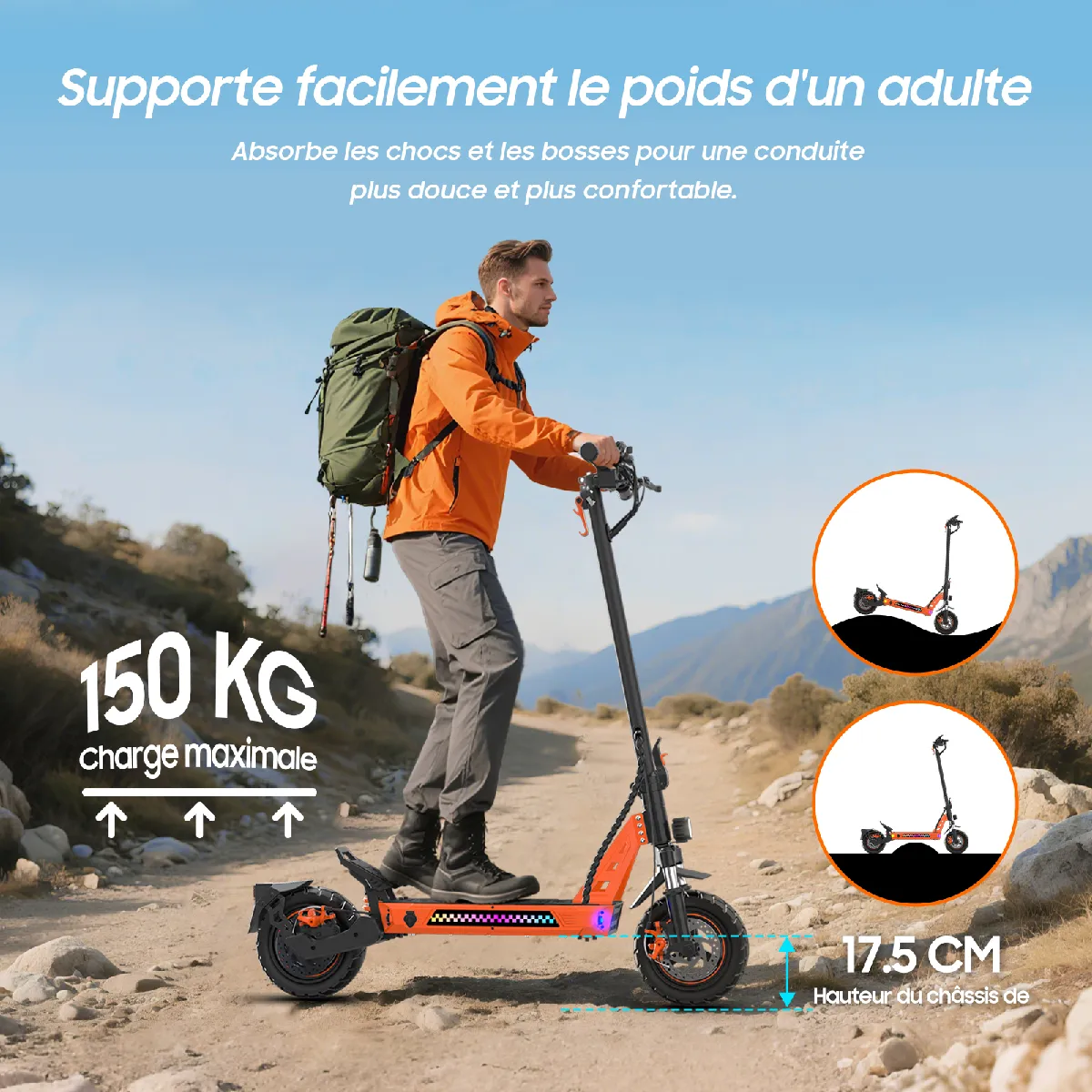 Robuust frame van aluminiumlegering en staal. Dubbele vering (voorvork + achtervering) en 10-inch luchtbanden absorberen schokken en zorgen voor stabiliteit en comfort, zelfs op ruwe wegen.