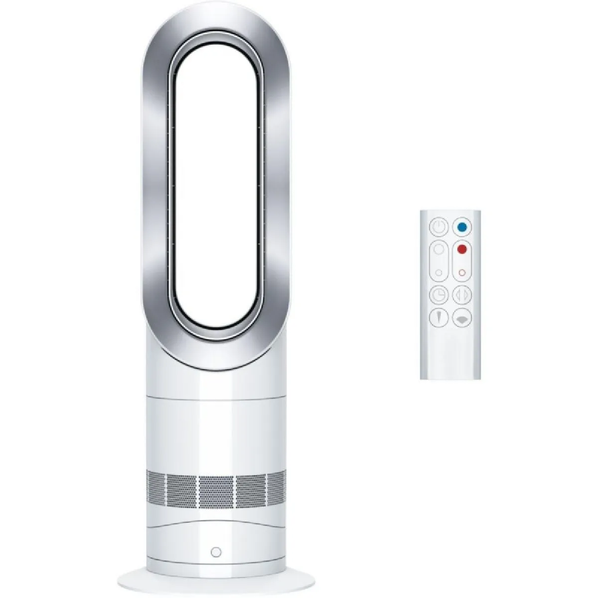De Dyson Hot+Cool AM09 heeft een strak design met afmetingen van 595 mm hoog, 153 mm breed en 113 mm diep, en weegt slechts 2,7 kg. De bladloze ring geeft hem een moderne uitstraling en zorgt tegelijkertijd voor een soepele en stille luchtstroom.