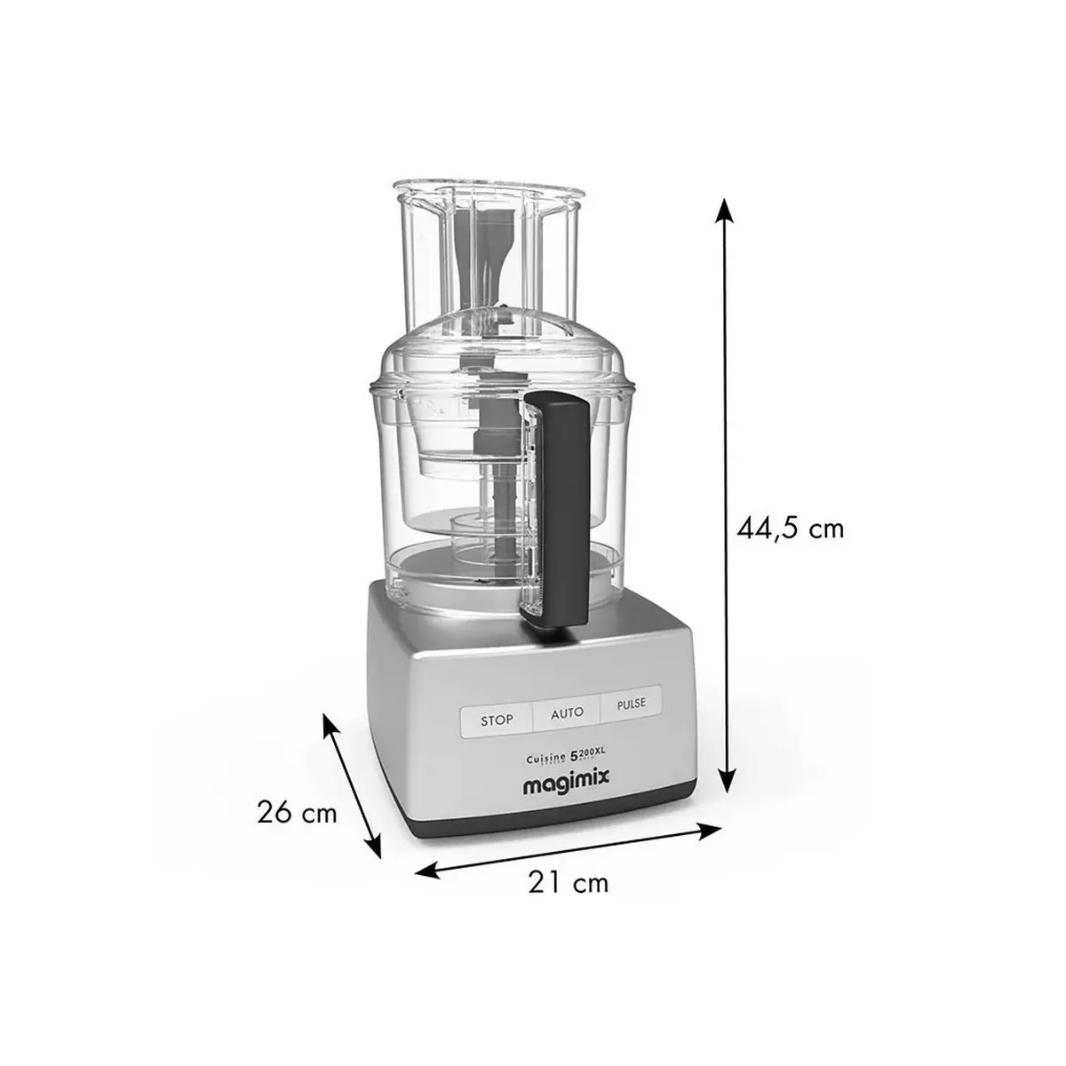 Voor gezinsmaaltijden zijn de capaciteiten duidelijk gedefinieerd: tot 1,2 kg brooddeeg, 1,4 kg gehakt, 1,8 liter soep, circa 8 eiwitten en 1,4 kg groenten om te snijden of te raspen. Het vermogen van 1100 W is geschikt voor zware recepten, terwijl de motor stil blijft voor comfortabel gebruik. De afmetingen van 44,5 × 21 × 26 cm maken het apparaat gemakkelijk op het aanrecht te plaatsen. De voedselveilige plastic kom is geschikt voor dagelijks gebruik en de uitneembare kom maakt schoonmaken en het overbrengen van ingrediënten snel en eenvoudig.