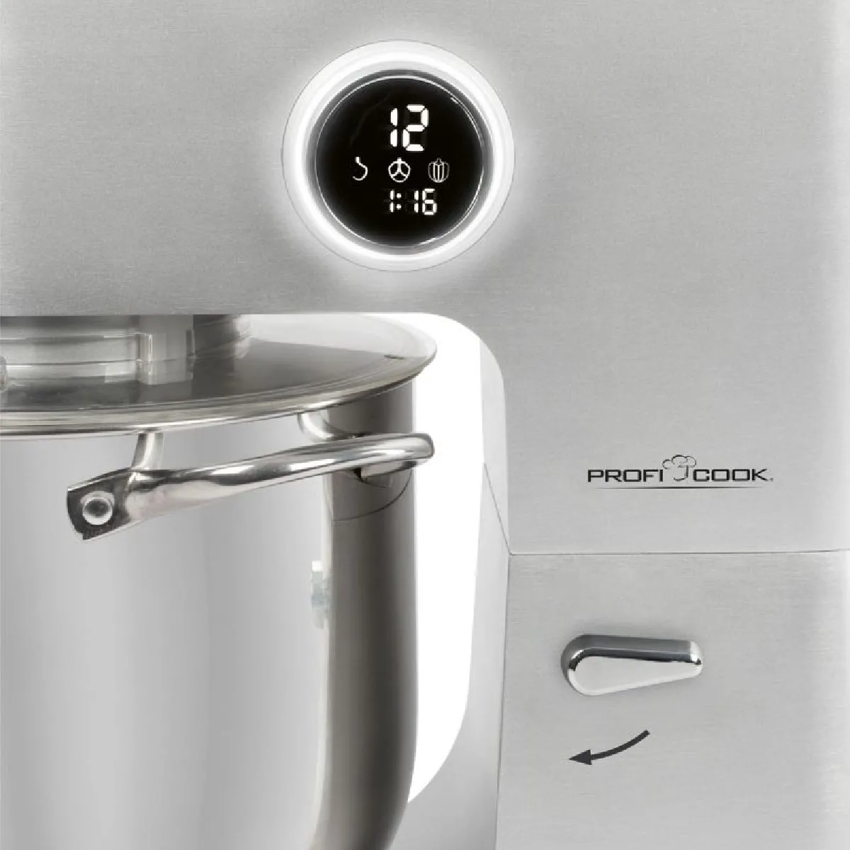 De roestvrijstalen kom van 12 liter, voorzien van twee handgrepen, heeft een inhoud van ongeveer 8 tot 8,5 kg deeg. De multifunctionele, draaibare arm met ontgrendelingsmechanisme vereenvoudigt de toegang tot de kom en het wisselen van gereedschap. Het transparante beschermdeksel heeft een vulopening om ingrediënten toe te voegen zonder het mengproces te onderbreken. Zuignappen zorgen voor een stabiele ondersteuning op het werkblad, zelfs bij hoge snelheden, voor consistent kneden en comfortabel gebruik tijdens langere sessies.