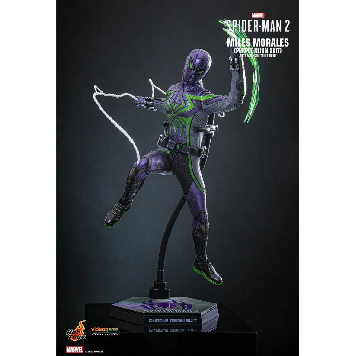1/6 schaalfiguur van Miles Morales in het Purple Reign-pak, geïnspireerd op de game Marvel's Spider-Man 2.