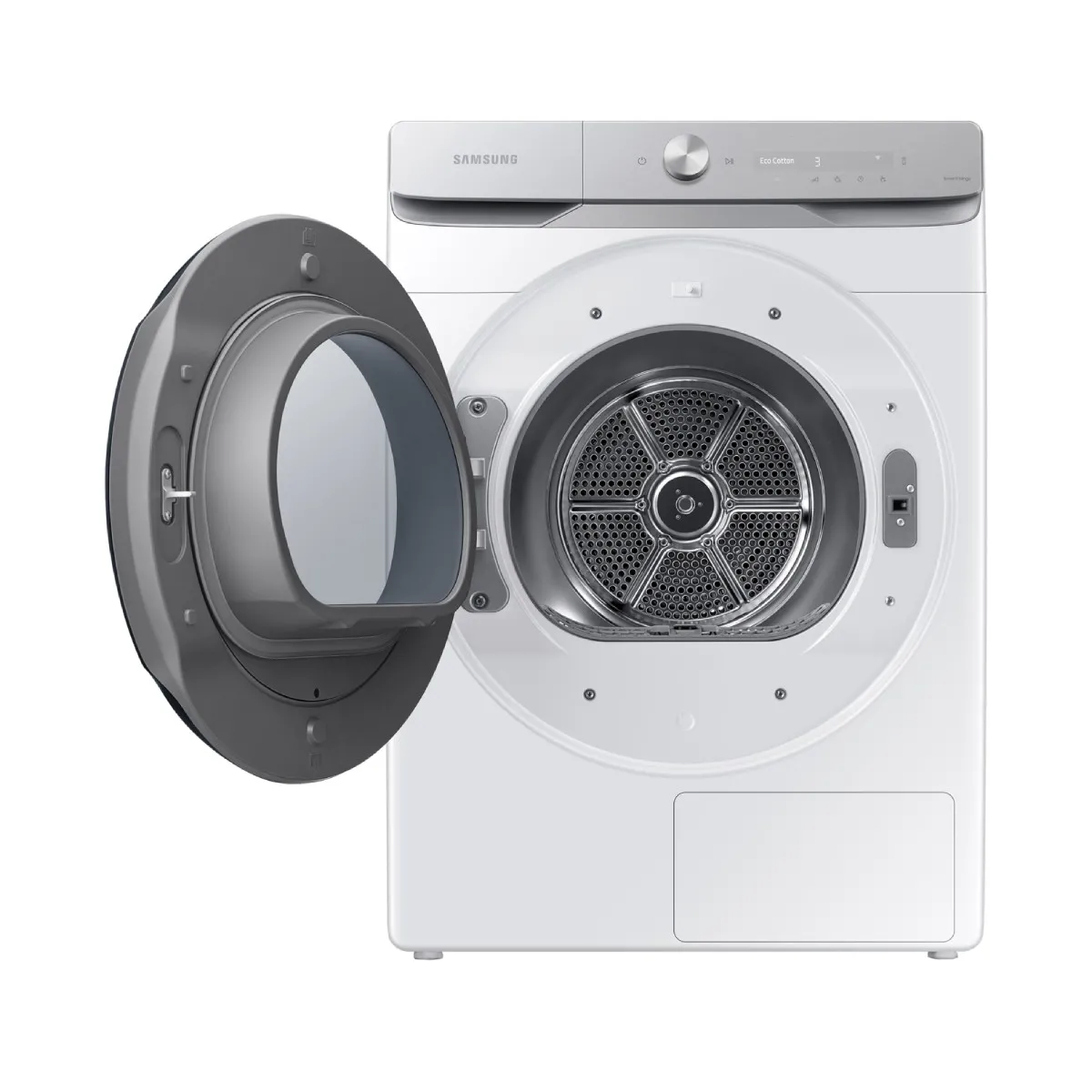 Deze voorladerdroger is ontworpen voor grote ladingen en kan tot 16 kg aan. De hybride warmtepomptechnologie optimaliseert de temperatuur en recirculeert warme lucht. AI Dry-sensoren bewaken continu het vochtigheidsniveau om het droogvermogen aan te passen aan het gewicht en het type wasgoed. De Diamond-trommel van 115 liter biedt ruimte aan lakens, handdoeken of sportkleding, terwijl de Digital Inverter-motor zorgt voor constante prestaties. Dankzij SmartThings Wi-Fi-connectiviteit kunt u de voortgang volgen en instellingen op afstand aanpassen. Met een geluidsniveau van 64 dB, trommelverlichting en een weergave van de resterende tijd voor beter zicht aan het einde van de cyclus, past de droger dankzij de omkeerbare deur gemakkelijk in een wasruimte.