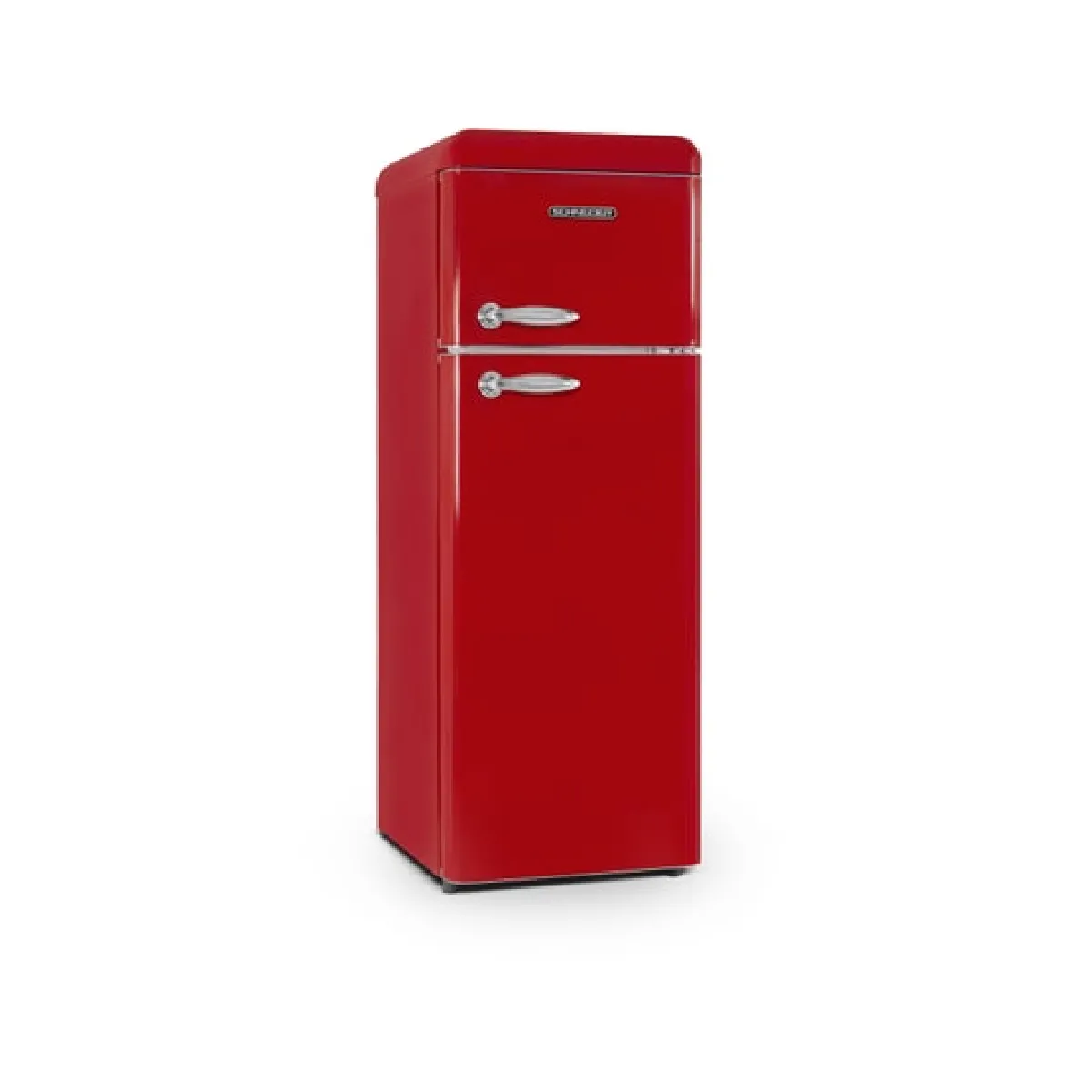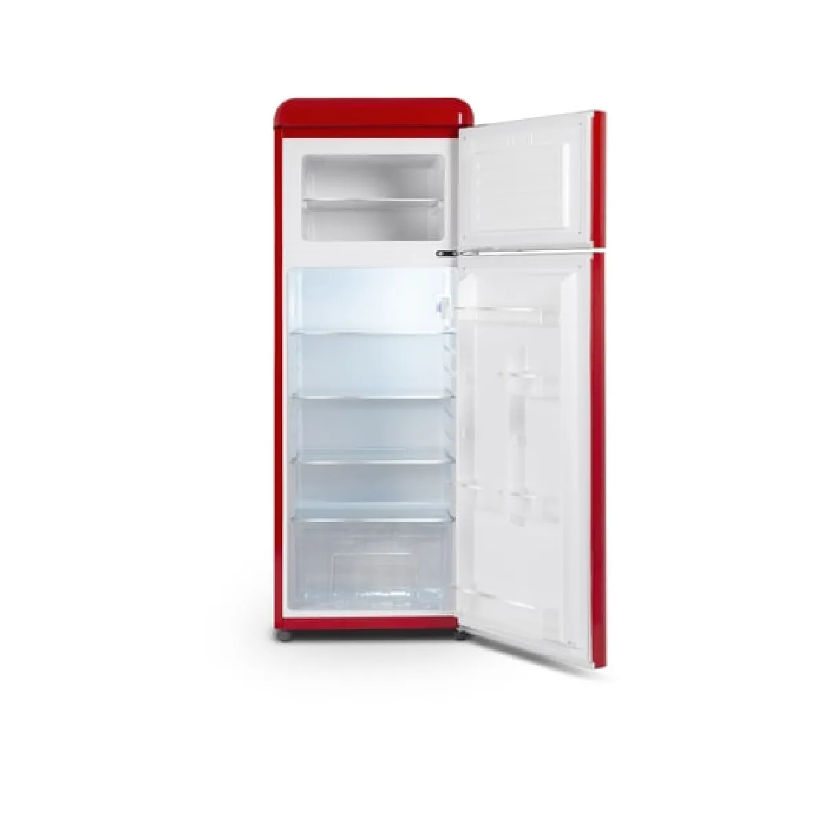 De rode afwerking en de vaste handgrepen in retrostijl geven het apparaat een opvallende visuele uitstraling. De verwijderbare deurafdichting maakt schoonmaken en vervangen eenvoudig wanneer deze versleten is. Zonder scherm of andere slimme functies geeft het apparaat prioriteit aan een directe en intuïtieve bediening. Het jaarlijkse energieverbruik bedraagt 174 kWh (klasse E), wat passend is voor een apparaat van dit formaat. Houd er rekening mee dat de deur niet omkeerbaar is bij het plannen van de plaatsing en de openingsrichting.