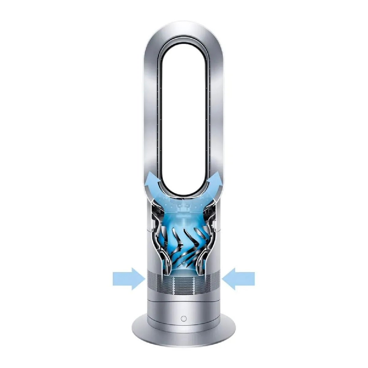De Dyson Hot+Cool AM09 heeft een strak design met afmetingen van 595 mm hoog, 153 mm breed en 113 mm diep, en weegt slechts 2,7 kg. De bladloze ring geeft hem een moderne uitstraling en zorgt tegelijkertijd voor een soepele en stille luchtstroom.