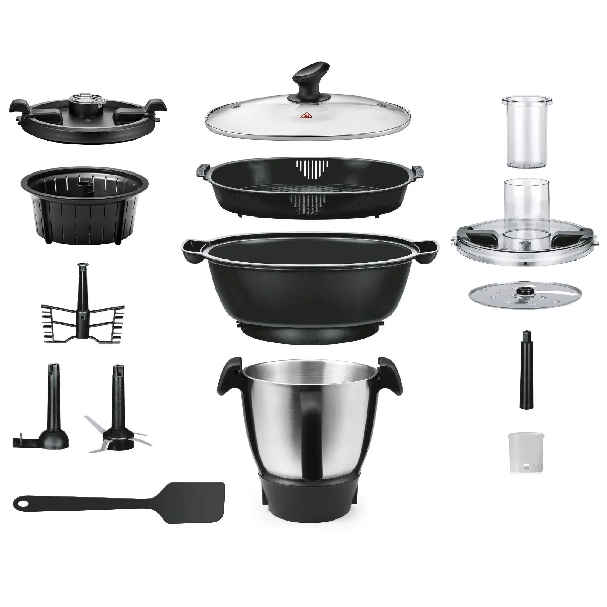 De meegeleverde accessoires zijn geschikt voor de meest voorkomende taken: een garde om te emulgeren, een mes met vier messen om te hakken, mixen en kneden, een omkeerbare roestvrijstalen schijf om te snijden, raspen en versnipperen, een siliconen spatel om te schrapen, een kleine en een grote stoommand, een kookmand en twee transparante deksels. De maatbeker helpt om de mand veilig uit de roestvrijstalen kom te halen. De verwijderbare roestvrijstalen kom is gemakkelijk schoon te maken en de ingebouwde weegschaal (in stappen van 5 g) zorgt voor nauwkeurige metingen en consistente resultaten.