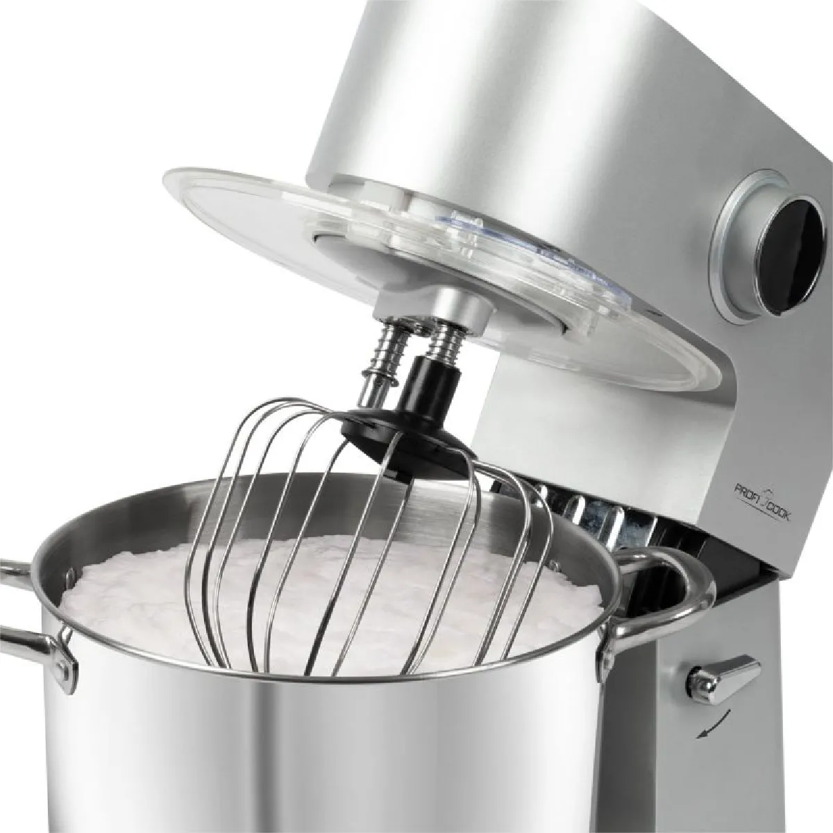 De roestvrijstalen kom van 12 liter, voorzien van twee handgrepen, heeft een inhoud van ongeveer 8 tot 8,5 kg deeg. De multifunctionele, draaibare arm met ontgrendelingsmechanisme vereenvoudigt de toegang tot de kom en het wisselen van gereedschap. Het transparante beschermdeksel heeft een vulopening om ingrediënten toe te voegen zonder het mengproces te onderbreken. Zuignappen zorgen voor een stabiele ondersteuning op het werkblad, zelfs bij hoge snelheden, voor consistent kneden en comfortabel gebruik tijdens langere sessies.