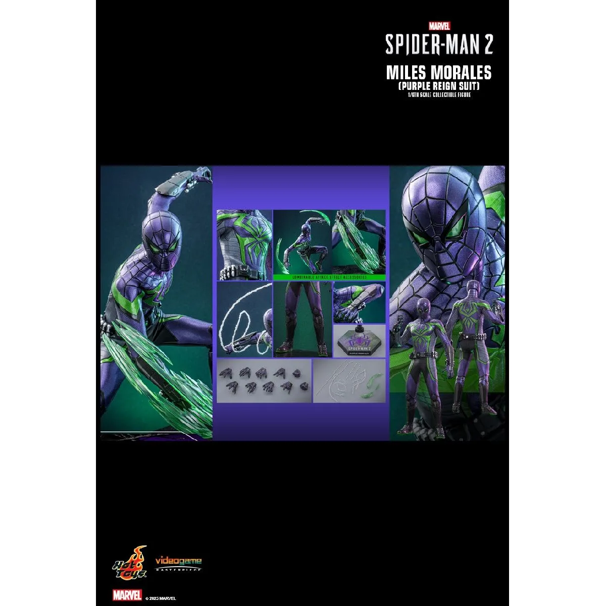 De 1/6 schaalfiguur is 30 cm groot en beweegbaar, met meer dan 30 articulatiepunten voor nauwkeurige en stabiele poses. Het Purple Reign-pak, met een metallic paars patroon, bevat elementen geïnspireerd op Prowler, waaronder een groen spinnenembleem op de borst en schoenen met bijpassende details. Het nieuw gebeeldhouwde hoofd met masker geeft het uiterlijk van het personage nauwkeurig weer. Verwisselbare handen, waaronder vuisten, ontspannen handen, open handen, webshooters en gebarende handen, maken het gemakkelijk om vechtscènes of acrobatische bewegingen na te bootsen.